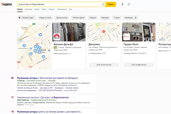 56 % поисковых запросов имеют географическую привязку. Вместе с сайтами в поисковой выдаче появляются карты с компаниями.